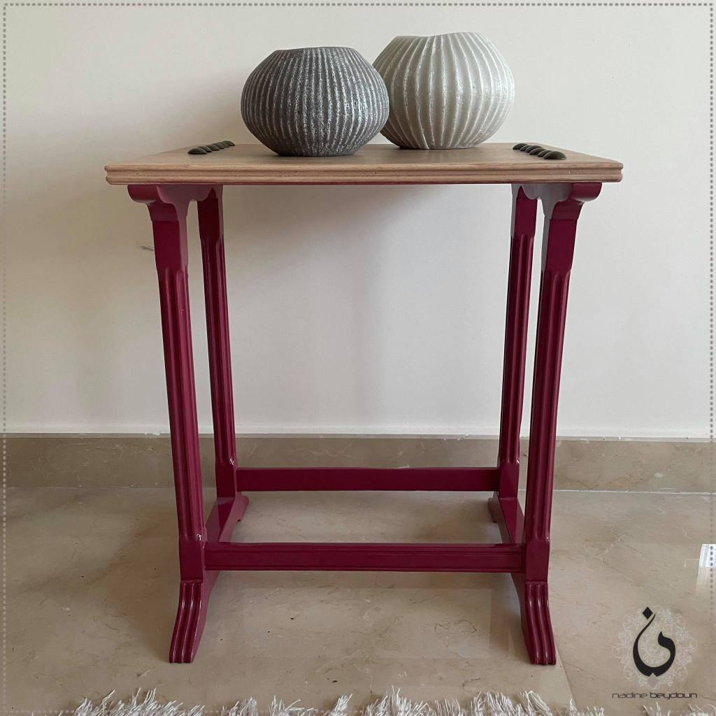 Buy Online #mybenchies with the fabric you voted for 😊!! Proudly #madeinlebanon with this subtle vintage feel, black and white geometric pattern fabric #myssonies and amazing glossy pink fuchsia legs.